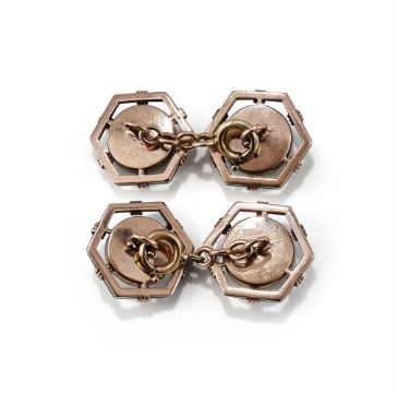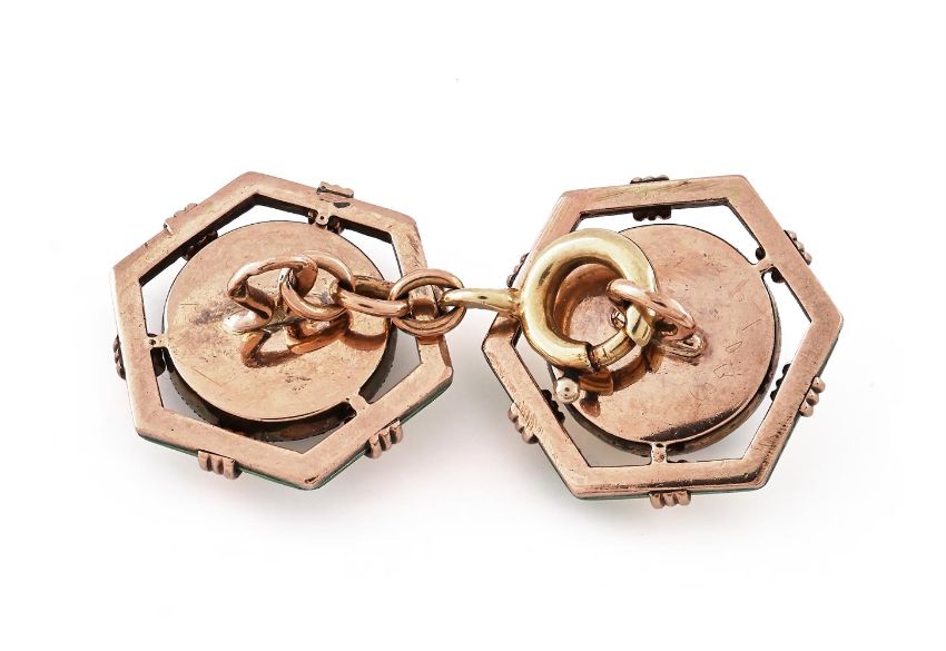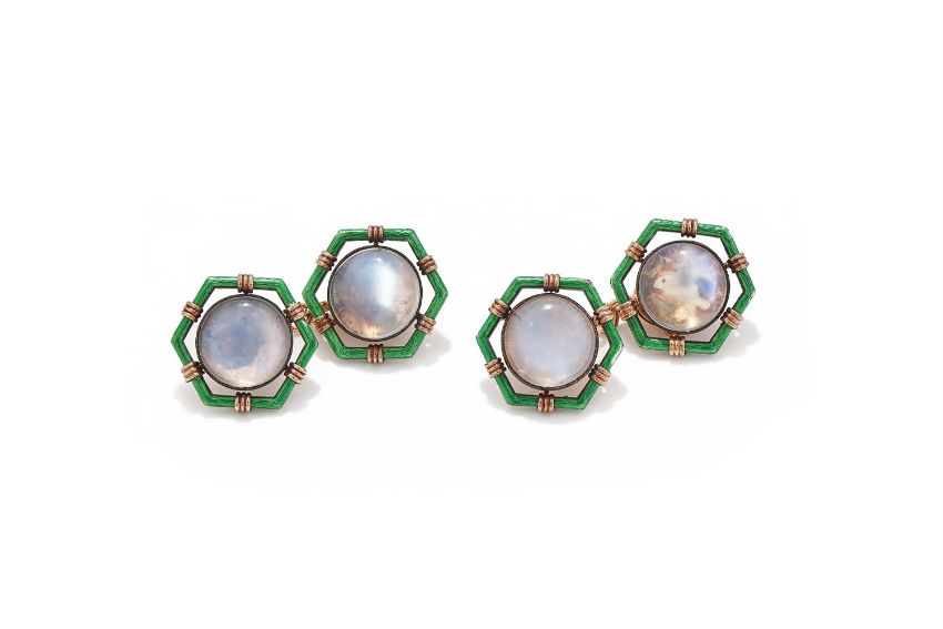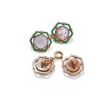 FABERGÉ, A SET OF FOUR MOONSTONE AND ENAMEL BUTTONS WORKMASTER AUGUST HOLLMING, ST. PETERSBURG, CIRCA 1890-1900 Each circular cabochon moonstone in a foiled closed back mount, within a green guilloché enamel hexagonal frame, later chain connectors, scratched inventory number 1003, buttons struck with workmaster initials A*H, 56 standard, later French small guarantee mark, stamped 583 Size/dimensions: terminals 1.7cm wide Gross weight: 14.6 gramsProvenance: Private Collection Condition Report: Foiling worn, moonstones abraded, chips to enamel mostly at corners. Some scratches, abrasions and nicks to button reverse. Later chain connectors stamped with 583 mark, some indistinct marks and a French small guarantee mark. Last link and clasp of a yellower toneCondition Report Disclaimer