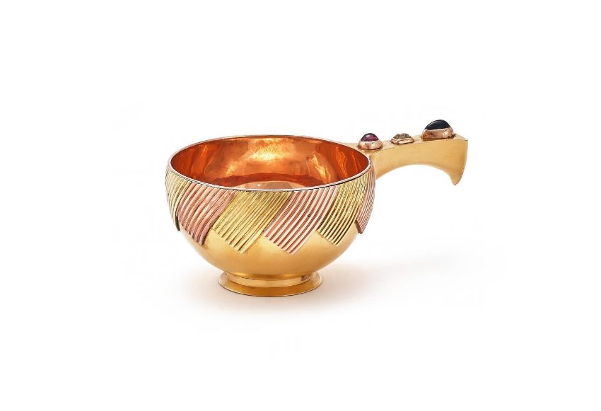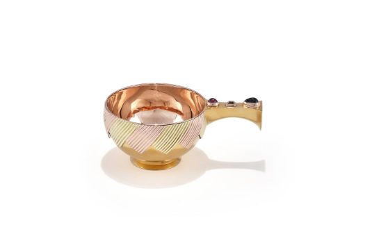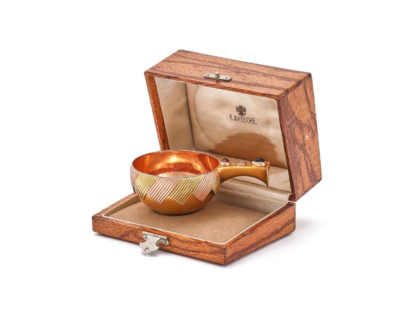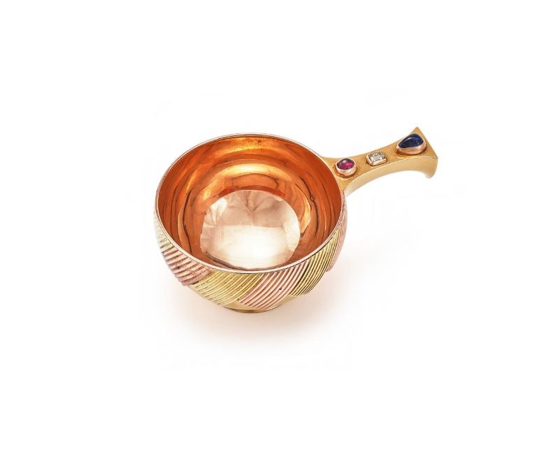 FABERGÉ, A GEM SET CHARKA WORKMASTER MICHAEL PERKHIN, ST. PETERSBURG, CIRCA 1895 The circular bowl and hook handle of yellow gold, the rim applied with reeded folds of alternating green and pink gold, the handle set with a pear shaped cabochon sapphire, rectangular step-cut diamond, and oval cabochon ruby, struck with workmasters initials MP in Cyrillic, 56 standard, scratched inventory number 37996 Size/dimensions: 8.5cm long Gross weight: 48.6 gramsProvenance: Private Collection Condition Report: Some nicks and surface scratches. Small signs of previous repair to bicoloured sleeve. Clear legible marks and numbering. Gemstones with light abrasion to top of cabochonsCondition Report Disclaimer