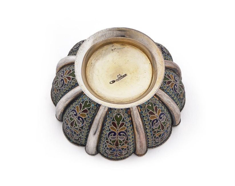KHLEBNIKOV, A RUSSIAN SILVER AND PLIQUE-À-JOUR ENAMEL BOWL MOSCOW, CIRCA 1910 With lobed sides, with panels of scrolling foliage within blue and transparent white dot frames, rope twist border, 84 standard, struck with Khlebnikov mark in Cyrillic with Imperial warrant Size/dimensions: 4.8cm high Gross weight: 140.7 gramsProvenance: Private Collection Condition Report: Slight tarnish/rust to a patch inside bowl. Some bleaching to blue enamel on the outside on one side, more vibrant inside. Some enamel crazing and small losses. tarnish to silver in recessed areasCondition Report Disclaimer