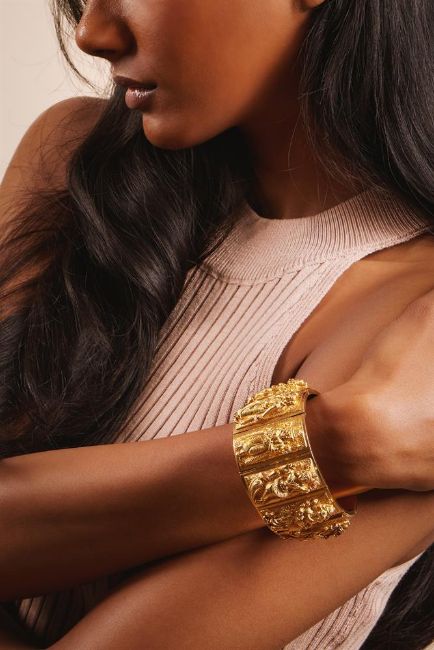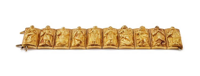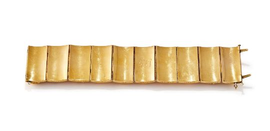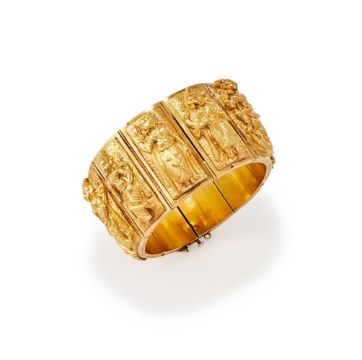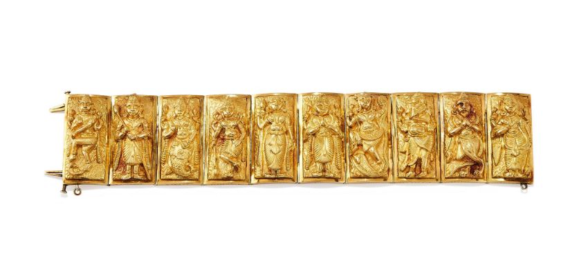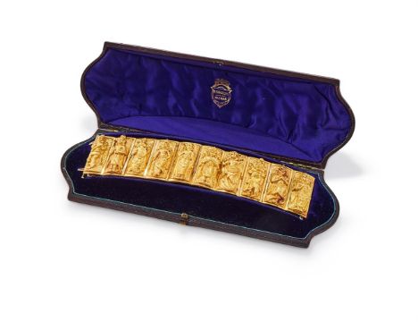AN INDIAN 19TH CENTURY GOLD BRACELET The ten rectangular panels each chased with a different Hindu deity, each panel inscribed to the side with from left to right: [...]aputhy, Numbeyar, Mutcha, Peroomaul, Pulaniondy, Siva, Cawlingamirthunum, Venayagur, Yagraputher, Vishtno, the reverse of the panels with polished closed backs and central scrolled monogram, with a double pin clasp, in a fitted P. ORR & SONS Madras case Size/dimensions: 18.4cm long Gross weight: 101.8 gramsPeter Orr and his brother Alexander, originally from Scotland, arrived in Madras, India, in 1843. Shortly after their arrival, they began working as watchmakers for the silversmith firm Gordon & Co. When Gordon retired in 1849, the Orr brothers took over the business, transforming it into the largest and most prestigious silversmith company in India. In 1876, Peter and Alexander were appointed Jewellers and Silversmiths to the Prince of Wales. The company became renowned for producing silverware and jewellery in the Swami style, which was inspired by Hindu gods and sacred scenes. The term Swami means deity in Tamil, and this distinctive style, typical of Madras and Southern India, gained significant popularity both in India and Europe, where royalties and aristocracy coveted the brand's creations. By 1903, the company's workshop employed over 600 artisans, according to official records. However, the firm faced significant challenges during the Second World War, forcing it to cease the production of silverware and jewellery and return to watchmaking.Today, many of the company's finest pieces are displayed in prestigious international museums, such as the Victoria and Albert Museum. Condition Report: The weight is without box. The bracelet rattles, it sounds a little like sand inside the panels, possibly disintegrated resin. There is small split to the bottom of one of the panels by the clasp, some general wear commensurate with age and use. The clasp is working well, slightly tricky to close, but in good order. The safety chain is later and where the chain has been soldered on obscures some of the letters from the first and last names of the deities. General wear commensurate with use, no gold marks or makers marks visible. The gold is not tested for carat, it is in our opinion it is likely to be 18 carat or more, however it has not been tested for gold carat due to the destructive nature of the test. 3.6cm wide.The box is in good condition considering age, but does have rubbing and scratches to the leather outer, and slight warping to the box, but it still closes fastened.  Condition Report Disclaimer