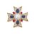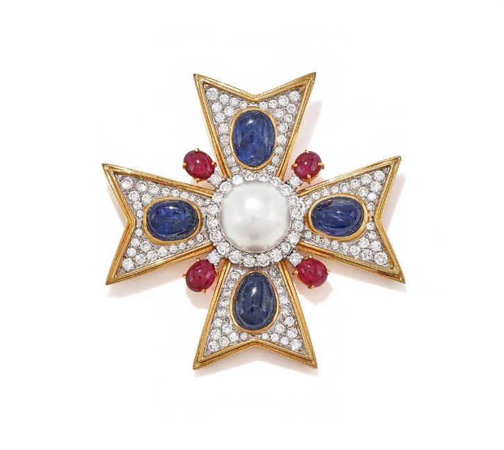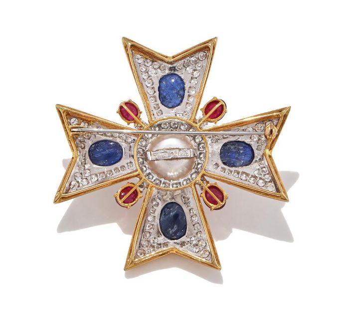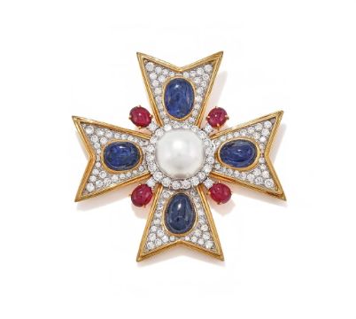 TRIO, A GEM SET MALTESE CROSS BROOCH Each arm collet set with an oval cabochon sapphire within a pavé set brilliant cut diamond surround, to a central cultured pearl and diamond cluster with cabochon ruby points, signed Trio, stamped 18K Size/dimensions: 5.5cm long Gross weight: 31.8 gramsProvenance: Private Collection