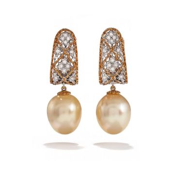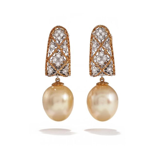 FEDERICO BUCCELLATI, A PAIR OF CULTURED PEARL AND DIAMOND EARRINGS Each pierced bi-coloured lattice surmount set with single cut diamonds, suspending a drop shaped South Sea cultured pearl measuring 15.5mm, post and clip fittings, signed Federico Buccellati, stamped 750 Size/dimensions: 4.0cm long Gross weight: 16.6 gramsProvenance: Private Collection Condition Report: Cultured pearls of a golden colour with good luster and nacre, well matched Clips with good tension. Overall in good conditionCondition Report Disclaimer