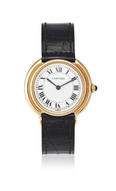 CARTIER, VENDÔME A GOLD COLOURED WRISTWATCH, NO. 780900307, CIRCA 1980Movement: Manual wind, 17 jewels Case: Gold coloured case, snap case back, stamped 18K with a poinçon Dial: White Strap: Unsigned black leather strap with Cartier gold coloured deployant clasp Size: 33mm Signed: Case, dial, movement, clasp Accessories: Cartier box Condition Report: Movement is currently functioning. Movement appears to be in a generally good condition with little sign of previous intervention when viewed under a 4x loupe. Dial appears to be in a generally good condition with no marks visible when viewed under a 4x loupe. Hands appear to be in a generally good condition.Glass appears free of significant scratches or marks when viewed under a 4x loupe. Case appears to be in good condition with minor scratches and marks. Crown has light scratches when viewed under a 4x loupe. Strap appears to be in good condition with minor marks and creasing. Buckle appears to be in good condition with minor marks and scratches when viewed under a 4x loupe.44g grossThis lot comes with a box but no papers.Dreweatts 1759 do not guarantee the working order or accuracy of any lots sold. Due to opening of the case back we recommend this watch is re-sealed by a qualified technician to ensure any stated water resistance is achieved.If you should have any further questions regarding this lot, please contact the Watch Department on 01635 553 553 or at watches@dreweatts.com           Condition Report Disclaimer