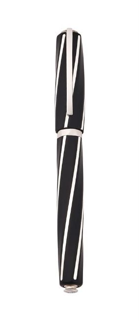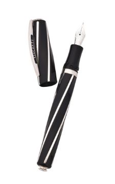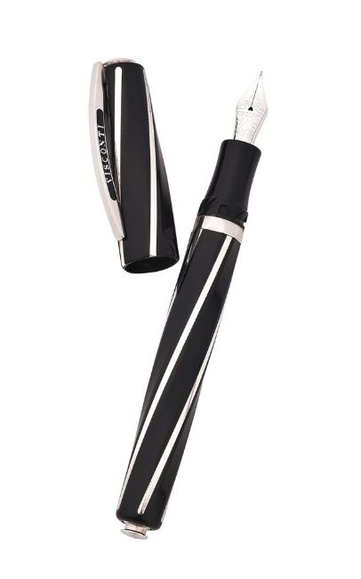 VISCONTI, DIVINA A BLACK FOUNTAIN PEN, CIRCA 2009 Cap and Barrel: Black lacquer and white metal wrythen cap and barrel, the cap with a clip Nib and Filling System: Medium white gold coloured nib stamped 14K 585, piston filling system, inked Accessories: Visconti box, guarantee/instruction booklet, a bottle of ink and associated outer card packaging  Condition Report: The outer card box is not original to this penCondition Report Disclaimer