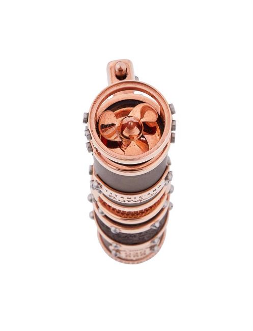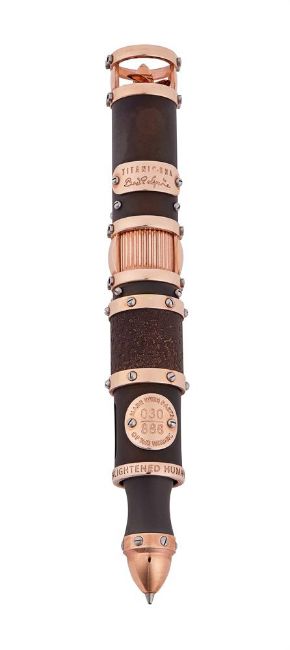ROMAINE JEROME, TITANIC DNA A LIMITED EDITION ROLLERBALL PEN, NO. 030/888, CIRCA 2009 Cap and Barrel: Palladium, steel and brass cap and barrel, with a clip, the end of the barrel with a propeller and a band of rusted steel from the Titanic Accessories: None