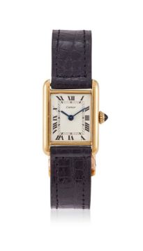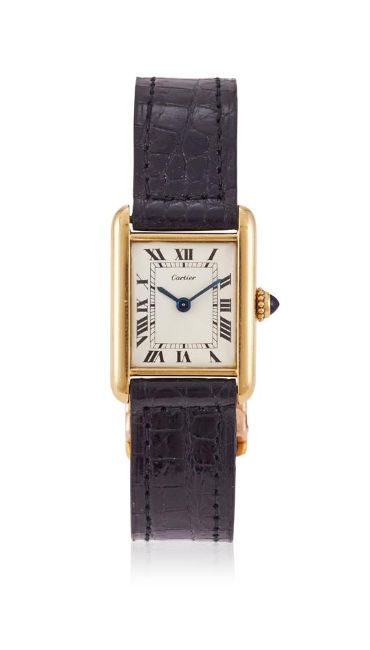 CARTIER, TANK, REF. 1703 A GOLD COLOURED WRISTWATCH, CIRCA 1974Movement: Manual wind Case: Gold coloured case, screwed down case back with four screws Dial: White Strap: Unsigned black leather strap with Cartier 18 carat gold deployant clasp, hallmarked London 1974 Size: 21mm Signed: Dial, clasp Accessories: Cartier box Condition Report: Movement is currently functioning. We have been unable to gain access to the movement to be able to report its condition. Dial appears to be in a generally good condition with no marks visible when viewed under a 4x loupe. Hands appear to be in a generally good condition.Glass appears free of significant scratches or marks when viewed under a 4x loupe. Case appears to be in good condition with minor scratches and marks. One of the case screw heads has sheared, we are unable to open the case. 20.5mm wide (excluding the crown) x 28mm longCrown has light scratches when viewed under a 4x loupe. Strap appears to be in good condition with minor marks and creasing. Buckle appears to be in good condition with minor marks and scratches when viewed under a 4x loupe.34g grossThis lot comes with a box but no papers.Dreweatts 1759 do not guarantee the working order or accuracy of any lots sold. We recommend this watch is tested by a qualified technician to ensure any stated water resistance is achieved.If you should have any further questions regarding this lot, please contact the Watch Department on 01635 553 553 or at watches@dreweatts.com           Condition Report Disclaimer
