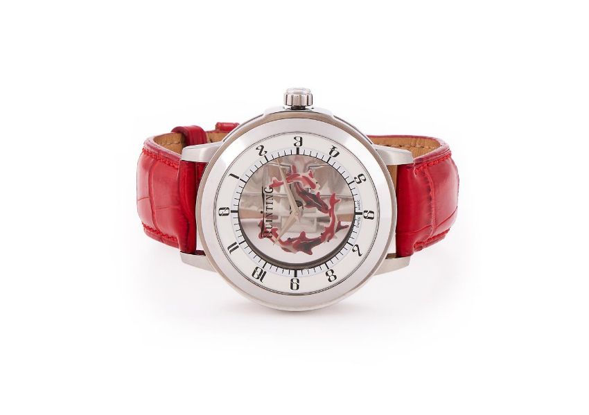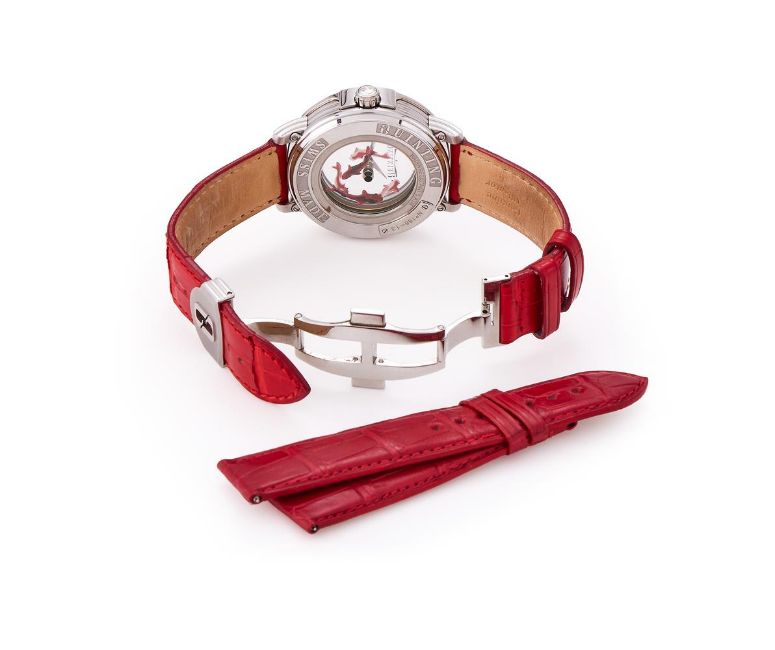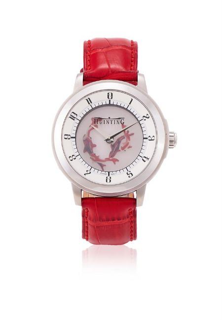 Y QUINTING, PIECE UNIQUE A STAINLESS STEEL WRISTWATCH, NO. 188-13Movement: Quartz Case: Stainless steel case, screwed down case back with four screws Dial: Seven transparent sapphire discs, hand painted with five Koi fish that rotate Strap: Quinting red alligator strap with double deployant clasp Size: 43mm Signed: Case, dial, crown, strap, clasp Accessories: Quinting box and spare red alligator strap Condition Report: Movement is currently functioning. We have been unable to gain access to the movement to be able to report its condition. Dial appears to be in a generally good condition with no marks visible when viewed under a 4x loupe. Hands appear to be in a generally good condition.Glass appears free of significant scratches or marks when viewed under a 4x loupe. Case appears to be in good condition with minor scratches and marks. Crown has light scratches when viewed under a 4x loupe. Strap appears to be in good condition with minor marks and creasing. Buckle appears to be in good condition with minor marks and scratches when viewed under a 4x loupe.This lot comes with a box but no papers.Dreweatts 1759 do not guarantee the working order or accuracy of any lots sold. We recommend this watch is tested by a qualified technician to ensure any stated water resistance is achieved.If you should have any further questions regarding this lot, please contact the Watch Department on 01635 553 553 or at watches@dreweatts.com           Condition Report Disclaimer