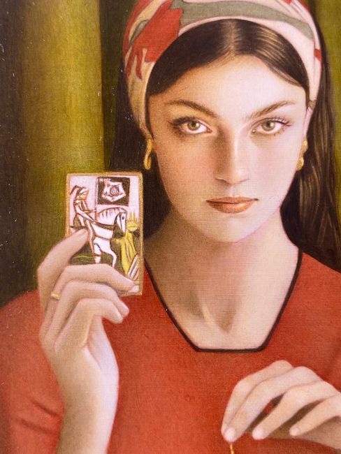 Abby's contribution to Art on a Postcard celebrates themes of strength and transformation. Created for International Women's Day, the painting portrays a powerful young woman as a modern fortune teller holding the Death card and a pendulum - symbols of change and renewal that honour women's resilience and evolving narratives. Designed to resemble a tarot card, the artwork incorporates gold framing and intricate accents, with Roman numeral "X" referencing the Wheel of Fortune card, symbolising life's cycles and turning points.