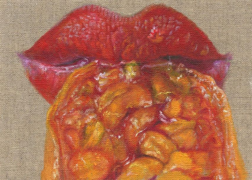 The abstracted curved, plump, and glistening forms of the paintings are as much fruits as they are bodies. The shapes seamlessly intertwine and break down leaving the viewer scanning the image to find moments of corporeal pleasure that sit right on the edge of both and neither.