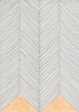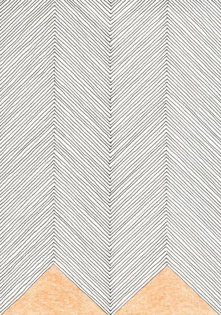 'Here we sit' is a methodical free-hand ink drawing of close-set chevrons, building up and enclosing at the lower edge two areas of warm glowing colour.