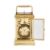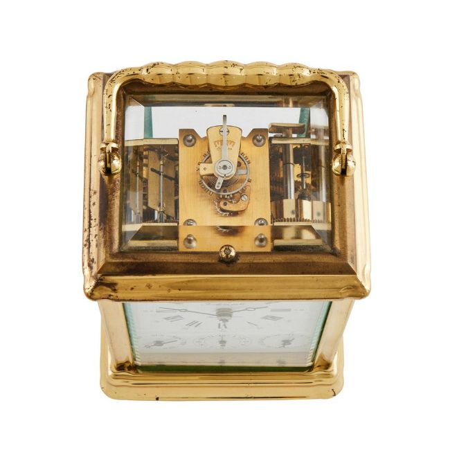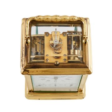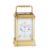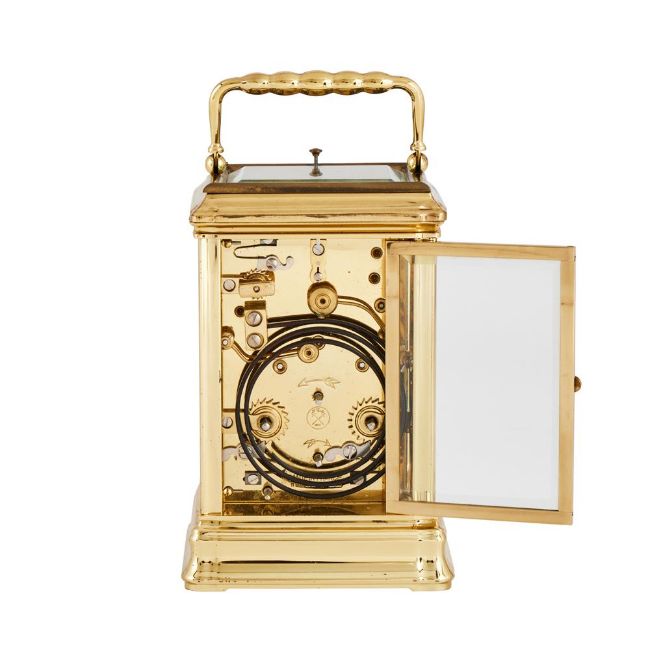 A FRENCH/SWISS LAQUERED BRASS GORGE CASED CALENDAR CARRIAGE CLOCK WITH PUSH-BUTTON REPEAT AND ALARML'EPEE, SAINTE-SUZANNE, FRANCE, LATE 20th CENTURYThe eight-day two train gong striking movement with platform lever escapement regulated by sprung monometallic balance, the inside of the frontplate stamped with serial number 00001466, the backplate with alarm to upper left and stamped with circular L'Epee, 1889 crossed swords trademark to centre over MADE IN FRANCE, 11 ELEVEN JEWELS UNADJ. to lower margin, the rectangular white enamel Roman numeral dial inscribed L'Epee, Fondie en 1839, Sainte-Suzanne, France to centre and with Arabic five minutes to outer track, over subsidiary alarm setting dial flanked by further day-of-the-week and date-of-the-month dials, the bevel-glazed gorge case with hinged carrying handle over full-width top glass, trip-repeat button to front rail, channel-moulded uprights, and pin-hinged door to rear, on ogee-outline base.15cm (6ins) high with handle down, 9.5cm (3.75ins) wide, 8.5cm (3.375ins) deep. Condition Report: Movement is in clean working condition. The alarm is out-of-sync with the hands (approx. 2 hours out) and the strike train often only strikes once at the hour (but repeats fine) suggesting that the rack is sticking - hence the movement requires a gentle clean/service. The subsidiary calendar dials are advancing correctly shortly after midnight. The dial appears free form any visible faults and the case is also in fine original condition with no visible chips or other damage to the glasses and light oxidation to the brass (mostly to the mounding bordering the top glass) only.Clock is complete with a winding key. Condition Report Disclaimer