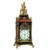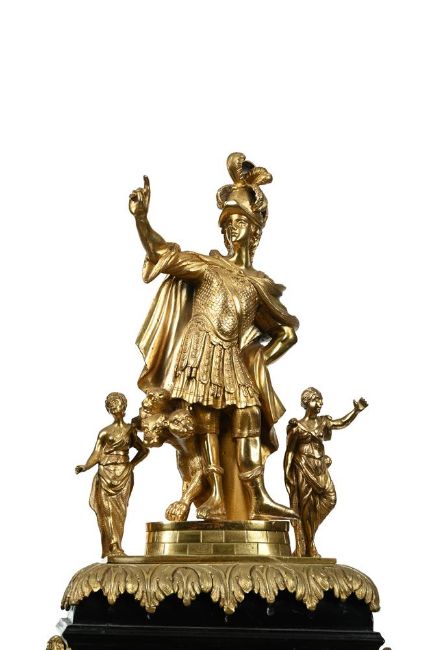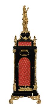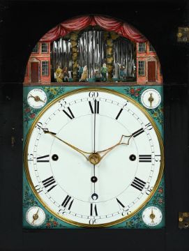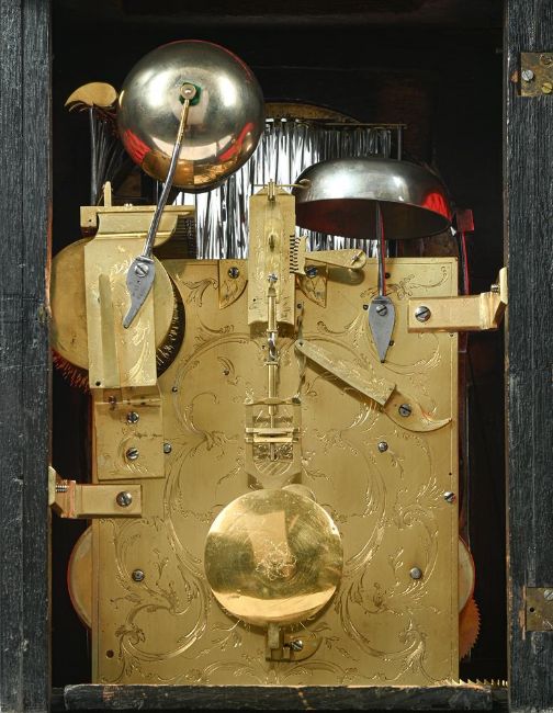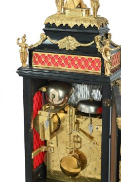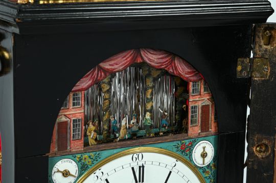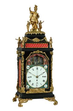 AN IMPRESSIVE GEORGE III GILT METAL MOUNTED MUSICAL AUTOMATON CENTRE SECONDS CALENDAR TABLE CLOCK UNSIGNED, LONDON, CIRCA 1790The substantial six pillar triple fusee bell-striking movement with plates measuring 8.75 by 7.25 inches and verge escapement regulated by lenticular bob pendulum incorporating unusual vertical rack slide regulation to suspension, the musical train playing a choice of six tunes on eleven bells with eleven hammers, via a 3.5 inch long 2.5 inch diameter pinned cylinder transversely positioned to the upper left of the backplate, every three hours after the sounding of the hour bell, the backplate engraved with a delicate arrangement of symmetrical rococo scrollwork around a central small basket of flowers within a scribed-line outer border, the 8 inch arched dial with circular fired white enamel Roman numeral chapter disc with Arabic five minutes beyond the outer minute track, with pierced brass hands and blued steel arrow sweep centre-seconds hand set within a moulded bezel surround, the spandrel areas with four fired enamel subsidiary dials, FASTER/SLOWER opposing selection for six tunes HORNPIPE/SANDY OF THE LEE/HELEN MACHREE/ROBIN GRAY/MINUET/HORNPIPE to the upper quadrants, over date-of-the-month opposing STRIKE/SILENT to the lower, within polychrome floral spray decorated verdigris painted infill, beneath arch composed with a realistically painted pair of red-brick townhouses flanking an aperture revealing ten parading figures modelled as actors, musicians and acrobats passing back and forth in front of three panels of glass spinning rod 'waterfall' automata, incorporating curved niche profile to the central bay of the backdrop and set within naturalistic leafy surrounds, the apex of the arch also bordered with painted representation of gathered drapery, the gilt brass mounted ebonised case with large fire-gilt figural surmount cast and chased as Mars wearing a feather-plumed helmet, armour and a cape, stood with the three-headed Cerberus on an oval plinth flanked by two further smaller figures of Classical maidens, over repeating leaf draped capping to the bell-top superstructure applied with rams-head adorned martial trophy decorated festoon mounts and lions masks at the angles to the concave sections, raised over a repeating rosette decorated gilt brass diamond lattice sound fret frieze flanked by further figural finials cast as Mars opposing a king applied to the corners above the ogee over concave top mouldings, the opening front with leaf cast fillet moulding bordering the glazed dial aperture surmounted by mask-centred husk swag decoration and applied with a generous martial trophy mount to lower rail, flanked by lions masks issuing further pendant husks and martial trophy motifs over stags head mounts to the canted angles, the sides with generous hinged carrying handles over rosette decorated gilt diamond lattice pierced arched sound frets and martial trophy mounts to lower margins, the rear matching the front, on cavetto moulded skirt base with generous acanthus scroll cast and chased supports.88cm (34.5ins) high, 35.5cm (14ins) wide, 28cm (11ins) deep. Although unsigned, the present lot does exhibit strong similarities with examples from the workshop of Francis Perigal who is recorded in Baillie, G.H. Watchmakers & Clockmakers of the World as gaining his freedom of the Clockmakers' Company on 1781, serving as Master in 1806 and dying 1824. Most notable amongst these features are the layout of the music work (transverse barrel set to the upper left of the backplate), use of fired enamel (both for the chapter disc and the subsidiaries), provision of sweep centre seconds set between the hour and minutes hands, and extensive use of glass-rod 'waterfall' automaton. Indeed, all of these elements can be seen in an example by Perigal sold at Christies, King Street, London sale of Magnificent Clocks 15th September 2004 (lot 16). The 'vine engraving' on the backplate can be also be closely compared to that on a table clock by George Margetts illustrated in Dzik, Sunny ENGRAVING ON ENGLISH TABLE CLOCKS, Art on a Canvas of Brass 1660-1800 on page 371 (Figure 20.4). Amongst the tunes is 'Auld Robin Gray' which is a Scottish ballad written by Lady Anne Lindsay in 1772; 'Sandy o'er the Lee' is also noted as 'Mr Baird's Favourite Reel' in Niel Gow's A Second Collection of Strathspey Reels of 1788. The extensive use of Martial motifs within the mounts of the present clock would suggest that it was originally supplied to a client with strong military connections; possibly for a regimental institutional or perhaps a wealthy member of the military class. Condition Report: CONDITION REPORT AVAILABLE ON REQUEST FROM THE DEPARTMENTCondition Report Disclaimer