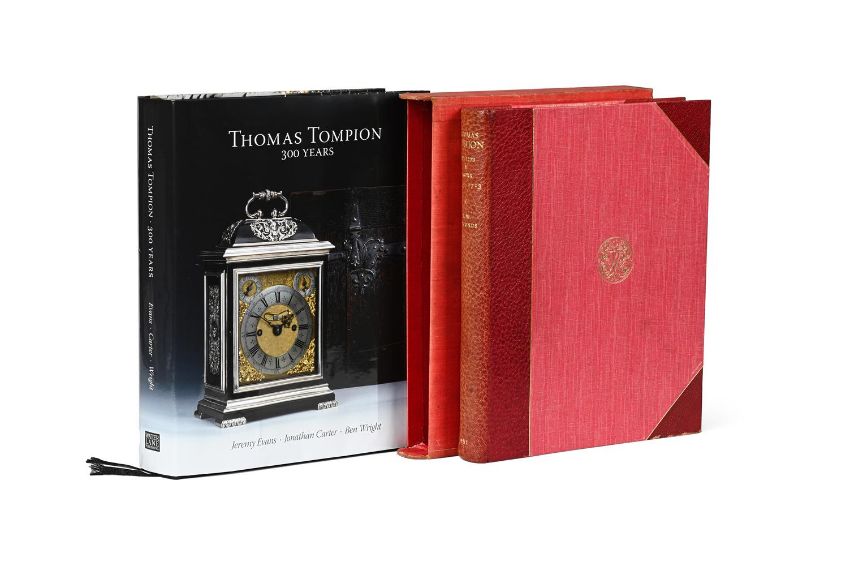 Ɵ EVANS, JEREMY; CARTER, JONATHAN AND WRIGHT, BENTHOMAS TOMPION, 300 YEARSWater Lane Publishing, Stroud 2013, dj; together with a copy of Symonds, R.W. THOMAS TOMPION HIS LIFE AND HIS WORK B.T. Batsford Limited, London 1951, limited edition number numbered 131 out of 350 copies and signed by the author, maroon and gilt tooled half calf bound with cloth covered slipcase, (2). Condition Report: Evans, Carter & Wright - page bundles now starting to pull-away from the binding (a common problem with this edition) but otherwise intact; also some slight rubbing to cloth and dust jacket but generally a clean copy.Symonds - light rubbing to binding only otherwise a good clean copy; slipcase with general moderate wear and grime build-up but structurally sound.Condition Report Disclaimer