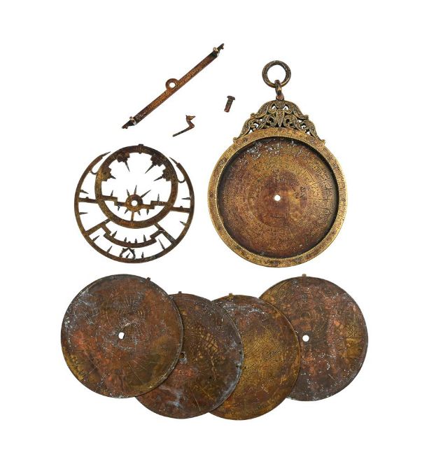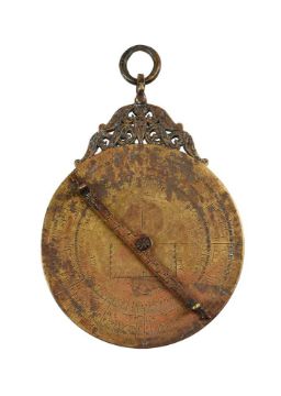 AN ISLAMIC BRASS ASTROLABE IN THE MAGHREBI STYLENORTH AFRICA, PROBABLY SECOND HALF OF THE 20th CENTURYThe mater with scroll-pierced crown and suspension ring over womb containing five 'tympan' discs each variously delineated with projections to one side only, set behind a pierced rete with ecliptic ring and twenty-eight star pointers, the rear with alidade incorporating opposing pin-hole sights rotating against divided concentric scales.18.5cm (7.25ins) high excluding suspension ring, 15cm (6ins) wide.