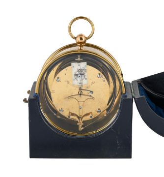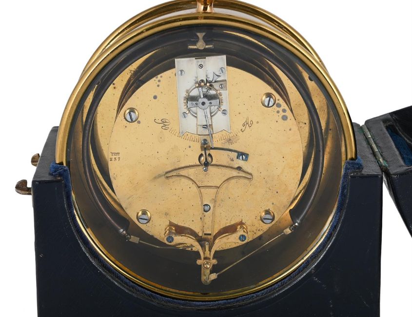 A RARE FRENCH COMBINED ANEROID BAROMETER AND TIMEPIECE COMPENDIUME. BOURDON AND RICHARD, PARIS, CIRCA 1875The circular eight-day single train timepiece movement with silvered platform lever escapement vertically planted on the backplate engraved with a regulation scale and stamped RICHARD, A PARIS over serial number 237 to left hand margin, the backplate also applied with a cocked gear for driving the centre arbor for the concentric-scale barometer hand, engaging with a delicate curved toothed rack pivoted beneath a shaped bridge and connected via a crank to the opposing ends of a curved Bourdon-type elliptical section aneroid pressure-sensing chamber enveloping the movement and secured to rear of the dial via a bracket at the apex, the lower rear edge of the dial plate further stamped with FR monogram roundel over 7180 and RICHARD, A PARIS, the circular two piece white enamel dial with recessed 3.5 inch Roman numeral centre and blued steel moon hands set within outer scale calibrated in barometric inches and annotated with the usual observations in German, the lower margin inscribed METALL, BAROMETER between E BOURDON, ET RICHARD, BREVETTE'S, PARIS, GOLDENE MEDAILLIE, DER AUST'NE 1849 and a second obscured/incomplete medallion, the cylindrical case with bevel-glazed hinged bezel fitted with a barometer recording pointer to the glass opposing conforming push-fit glazed bezel to rear, beneath suspension ring pivoted within a ball-shaped post to top; cradled in original dark blue velvet-lined Morocco covered travelling case with hinged brass carrying handle to the arched-top and removable dial shutter panel to front.The timepiece 15cm (6ins) diameter, 7.5cm (3ins) deep, and 17cm (6.75ins) high with handle down; the case 22cm (8.5ins) high with handle down, 17cm (6.75ins) wide, 10cm (4ins) deep.  The firm Freres Richard is noted in Banfield, Edwin Antique Barometers, an illustrated survey as being founded in Paris in 1858. Although they were predominantly clockmakers Richard Freres produced barometers for the engineer and inventor Eugene Bourdin who had devised a design of aneroid barometer alongside Lucien Vidie. Both Bourdon and Vidie exhibited Aneroid Barometers at the Great Exhibition of 1851; Vidie subsequently sued Bourdon for the infringement of his Patent. Vidie initially lost the case but was granted an award of 10,000 francs on appeal in 1861 by which time his patent had expired. The present lot is a fairly rare model with only around 500-600 believed to have been made by Richard, and benefits from retaining its original travelling case in fine condition. Condition Report: REPORT UPDATED 12/02/2025The timepiece movement is in relatively clean working condition and appears free form any visible alteration or noticeable replacements, a precautionary gentle clean/service may be advisabele. The barometer mechanism also appears to be in good condition and will respond to change in pressure when 'bag tested'. The Bourdon tube however is a replacement so no assurances as to the accuracy of the barometer can be provided. The timepiece dial is in very good condition with no visible damage other than a couple of light surface scratches. The outer concentric barometer scale however has a filled loss/chipping to the lower edge causing the right-hand medallion to be mostly missing; there are also numerous less visible hairline cracks to the barometer ring. The case is in fine condition with minimal blemishes/discolour to the lacquer finish. The outer leather travelling case is also in fine condition with only minimal wear to the interior linings and some very slight wear/scratching to the exterior.Timepiece is complete with a winding key. Condition Report Disclaimer