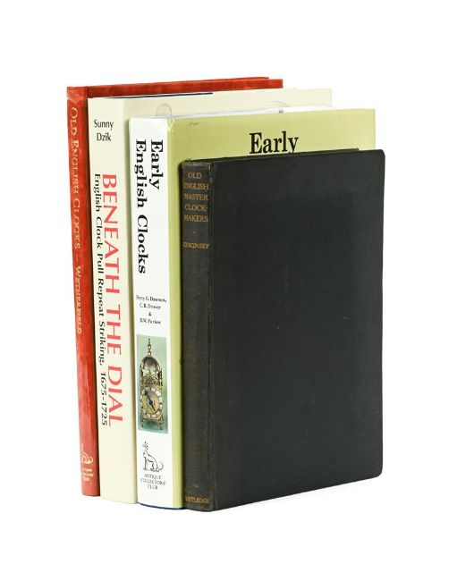 Ɵ DZIK, SUNNYBENEATH THE DIAL...English Clock Pull Repeat Striking 1675-1725 Wild Boar Publications, printed by Holywell Press Oxford 2023, dj; together with copies of Dawson, P.G., Drover, C.B. and Parkes, D.W. Early English Clocks Antique Collectors' Club, Woodbridge 1982, dj; Britten, F.J. OLD ENGLISH CLOCKS, THE WETHERFIELD COLLECTIONlimited edition numbered 723 out of 1,000 copies, Antique Collectors' Club, Woodbridge 1980, gilt tooled faux hide, and a copy of Cescinsky, Herbert THE OLD ENGLISH CLOCKMAKERS AND THEIR CLOCKS 1670-1820 George Routledge and Sons Limited, London 1938, (4).