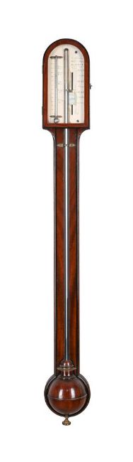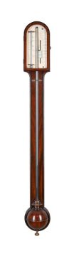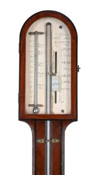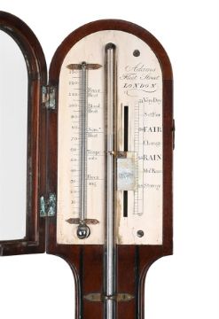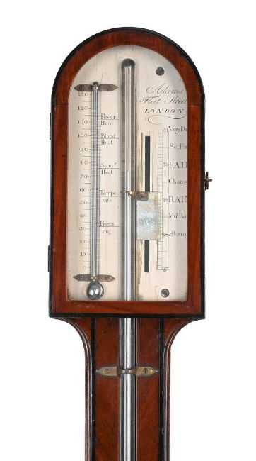 Y A GEORGE III MAHOGANY MERCURY STICK BAROMETERADAMS, LONDON, CIRCA 1790The arched case with ebony-edged glazed mahogany door enclosing arched silvered Vernier scale calibrated in barometric inches and with the usual observations beneath signature Adams, Fleet Street, LONDON to the right-hand side, opposing mercury tube Fahrenheit scale thermometer to the left, with visible tube to the ebony banded caddy moulded trunk over hemispherical cistern cover incorporating level adjustment screw to underside.94.5cm (37.75ins) high, 12cm (4.75ins) wide. Provenance:The Dr. Castle Collection of barometers and other weather instruments.  George Adams junior is recorded in Banfield, Edwin BAROMETER MAKERS AND RETAILERS 1660-1900 as being apprenticed to his father (also called George) in 1765 and taking over the family business at 60 Fleet Street, London on his father's death in 1773. He continued in his father's tradition of producing outstanding instruments and became instrument maker to George III and optician to the Prince of Wales. He died in 1795 leaving the business to his younger brother, Dudley, who operated until his death in 1826. Further information regarding the Adams family and their work can be found in Goodison, Nicholas ENGLISH BAROMETERS 1680-1860 pages 116-129.