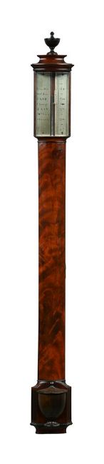 Y A FINE GEORGE III FIGURED MAHOGANY BOWFRONTED 'FLAT-TO-THE-WALL' MERCURY STICK BAROMETERRAMSDEN, LONDON, CIRCA 1795With ebonised shouldered urn finial to the concave-sided upstand and cavetto cornice, over rectangular bow-glazed silvered Vernier scale calibrated in barometric inches to the right hand side opposing the usual observations to the left, the lower left corner signed Ramsden, London, the trunk of the same bowed profile incorporating Vernier setting square beneath the cavetto throat moulding over fine figured veneers line-edged in ebony, the base with turned ebonised half vase cistern cover flanked by canted angles inlaid with ebony 'flutes' over cavetto moulded underside.103cm (43ins) high, 11cm (4.25ins) wide.  Jesse Ramsden is recorded in Clifton, Gloria Directory of British Scientific Instrument Makers 1550-1851 as working from several addresses in London 1762 until his death in 1800, however by 1782 both his workshop and principal retail outlet were on Piccadilly. He was one of the finest instrument makers of the period being particularly well known for his invention of a dividing engine and subsequent equatorial telescope stands.  Condition Report: Tube is filled with no apparent airlocks (mercury column will rise all the way to the top of the tube when instrument is tilted). The silvering is in fine condition with nice even colour and the Vernier slide is in working condition. The case is generally in fine condition with faults very much limited to very minor age-related wear. There is no setting key for the Vernier/cistern level included with the instrument. Condition Report Disclaimer