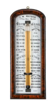 A VICTORIAN MAHOGANY CASED STORM GLASST.W. WATSON, LONDON, CIRCA 1880The shallow arch white-opaque glass panel applied with a central cylindrical glass cannister filled with fluid, the upper margin inscribed T.W. WATSON, 4. PALL MALL, London over Storm, Glass and two columns of various INDICATIONS titled FOR FINE WEATHER opposing FOR RAIN, then HIGH WINDS, OR STORM and finally additional appearances for various polar currents to lower section, the bottom margin inscribed REGISTERED, 351867 set with a shallow-arched cross-grain moulded mahogany surround.52cm (20.5ins) high, 20.5cm (8ins) wide. Provenance:The Dr. Castle Collection of barometers and other weather instruments. Purchased at Dickens Fine Art Auctioneers, Middle Claydon, sale of the THE RICHARD COOKSON COLLECTION 20th April 2008 (lot 78) for £440 hammer. Thomas William Watson is recorded in Banfield, Edwin BAROMETER MAKERS & RETAILERS 1660-1900 as an optical, philosophical and mathematical instrument maker working from 4 Pall Mall, London 1878-84. The origins of this type of Storm Glass are unknown with Admiral Fitzroy in his 1863 publication The Weather Book noting that 'the inventor is now uncertain; but they were sold on old London Bridge, at the sign of the Goat and Compasses'. He studied them as curiosities and suggested that they served to indicate what he termed 'electrical tension' in the wind, hence were potentially useful as meteorological instruments. Edwin Banfield in BAROMETERS, Stick or Cistern Tube adds that such instruments are really an irregular form of thermometric barometer, and goes on to list the recipe for the contents of the tube which contains water, alcohol, ammonium chloride, potassium nitrate and camphor. The solution, once prepared, would then exhibit changes in the form of cloudiness, crystal formation etc. signifying atmospheric conditions as per the indications listed on the panel. Condition Report: Tube is filled with fluid. The glass panel has an edge chip at the centre of the lower margin otherwise is in fine condition with overall light wear to the annotations only. The case is in fine original condition with faults limited to slight shrinkage and other age-related blemishes; the rear panel has replacement securing screws.  Condition Report Disclaimer