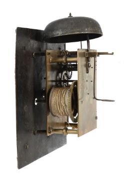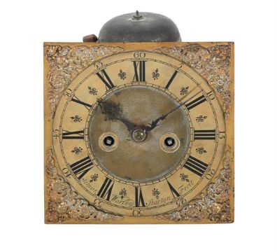 A QUEEN ANNE EIGHT-DAY LONGCASE CLOCK MOVEMENT WITH TEN-INCH DIAL SAMUEL WORLEY, STARTON, CIRCA 1710The five pillar inside countwheel bell striking movement with anchor escapement for regulation by a seconds pendulum, the 10 inch square brass dial with ringed winding holes to the matted centre within applied Roman numeral chapter ring with fleur-de-lys half hour markers, Arabic five minutes beyond the outer minute track and signed Simon, Worley, Starton, Fecit to lower margin, with scroll pierced steel hands and unusual winged cherub, Lambrequin and foliate scroll cast spandrels to angles, (no seatboard pendulum, weights or pulleys).28cm (11ins) high including the bell, 15cm (6ins) deep.  Samuel Worley is recorded in Loomes, Brian Clockmakers of Britain 1286-1700 as working in Starton (believed to be Staverton, Wiltshire), circa 1700-1720.