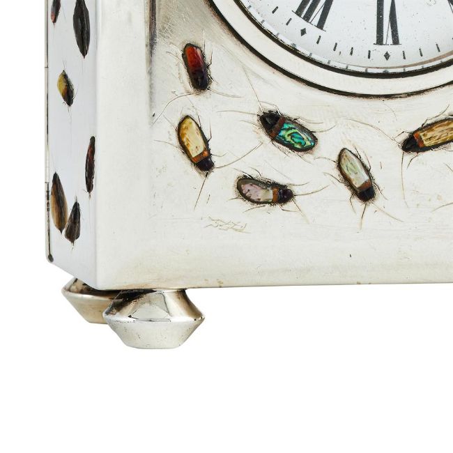 Y A RARE GEORGE V SHIBAYAMA INSECT DECORATED SILVER CARRIAGE TIMEPIECETHE CASE BY A. AND J. ZIMMERMANN LIMITED, BIRMINGHAM 1911 The French rectangular eight-day single train movement with platform lever escapement regulated by sprung monometallic balance, with integral winder to backplate stamped with standing lion trademark for Duverdry and Bloquel, the 2 inch circular white enamel Roman numeral dial with blued steel spade hour hand set behind a convex glass within moulded bezel, the rectangular case with hinged C-scroll carrying handle over front and sides inlaid in mother-of-pearl, amber, abalone and other materials with random crawling insects incorporating engraved legs and antennae and with very small Japanese character signature to lower right hand corner of the front panel, the front also with canted surround to the fascia and the rear with conforming hinged door, on disc feet, Hallmarks for London 1911 makers A. &. J. Z within a shield.The clock 11.5cm (4.5ins) high with handle down, 7.5m (3ins) wide, 5.7cm (2.25ins) deep.  The firm of A. and J. Zimmermann Limited were a firm of silversmiths mostly specialising in small decorative items who worked from Regent Street, Birmingham from 1899 until 1929 when they were placed into voluntary liquidation. The clockmaking factory of Duverdry and Bloquel is noted by Leigh Extence as originally founded by Albert Villon in the town of Saint-Nicolas-d'Aliermont in 1867. Paul Duverdry joined the firm as a director in 1887 followed by Joseph Bloquel in 1910. The execution of Shibayama 'insect' decoration of the current lot would have been undertaken by a specialist Japanese craftsman resulting in a highly unusual luxury product. A similar but much smaller timepiece, with decoration apparently executed by the same Japanese craftsman into a silver case by Charles and Richard Comyns, London, was sold in these rooms FINE CLOCKS, BAROMETERS & SCIENTIFIC INSTRUMENTS 2nd March 2022 (lot 196) for £3,800 hammer.