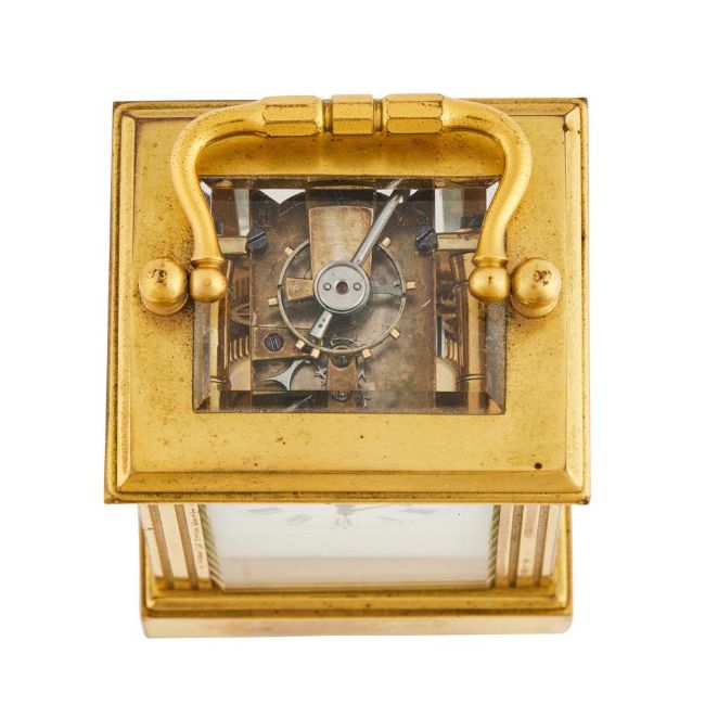TWO FRENCH MINIATURE CARRIAGE TIMEPIECESONE STAMPED WITH INITIALS L.D., CIRCA 1900 AND LATEREach with eight-day single train movement incorporating platform lever escapement regulated by sprung balance, the oval example stamped L.D. within an oval to the top left-hand corner of the backplate, both with rectangular white enamel dials, the first of Mignonette No. 1 size in rectangular bevel-glazed case with hinged carrying handle over double-cavetto top mouldings, channelled corner uprights and moulded skirt base, the second of slightly larger oval form with thick curved glasses and moulded base, (2).The oval example 8.5cm (3.375ins) high with handle down, 6.5cm (2.5ins) wide, 6.8cm (2.25ins) deep. Such Miniature timepieces are called Mignonettes or 'little darlings' and mostly come in three graded sizes with No. 1 being the smallest.
