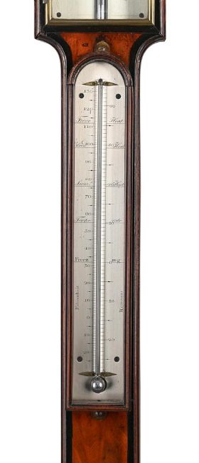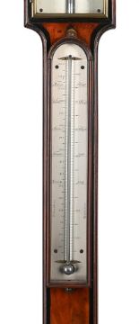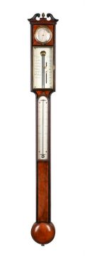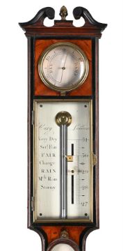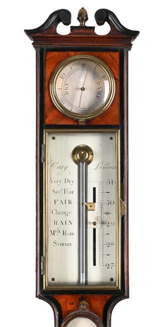 Y A FINE GEORGE III EBONY BANDED MAHOGANY MERCURY STICK BAROMETER WITH HYGROMETERCARY, LONDON, CIRCA 1800The case with swan neck pediment over circular silvered hygrometer annotated DAMP/DRY set behind convex glazed brass bezel, over rectangular brass-framed glazed door enclosing silvered Vernier scale calibrated in barometric inches to right hand side opposing the usual observations to the left beneath signature Cary, London to upper margin, the ebony-banded caddy moulded trunk applied with arch glazed silvered Fahrenheit and Reaumur scale mercury thermometer over circular convex cistern cover to the rounded base incorporating level adjustment screw to underside.108cm (42.5ins) high, 14cm (5.5ins) wide. The celebrated Cary family business of scientific instrument and globe makers was established by John Cary at Johnson's Court, Fleet Street, London in 1782 moving to a new address at 'Corner of Arundel Square', Strand the following year. He was primarily an engraver of maps, charts and globes who moved again in 1783 to 188 Strand. By 1791 he had entered into what appeared to be a relatively casual partnership with his brother, William; this partnership lasted until circa 1816 by which time William and John Cary had moved again to 181 Strand before finally settling in 86 St. James in 1820. The following year he was succeeded by his sons, John (II) and George Cary, who continued from the firm's 181 Strand address until 1851/2 when the business was acquired by Henry Gould. Condition Report: Instrument is in good original condition having been cosmetically restored at some time in the fairly recent past. The tube is filled with mercury however the column stops a little short of the top of the tube when the instrument is tilted slightly suggesting the presence of some air. The register plate has good clean even silvering and. the brass door is in sound condition however we do not have a key for the lock. The thermometer is in fine working condition. The case is generally very good. The pediment appears original but with evidence that some of the ebonised mouldings may have come loose and been re-stuck at some point. Both sides of the case at the cistern level have some slight bruising otherwise faults to the case are limited to minor bumps, scuffs shrinkage and wear commensurate with age and use.Condition Report Disclaimer