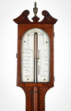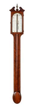 A RARE GEORGE III SCOTTISH CHEVRON-EDGED MAHOGANY MERCURY STICK BAROMETERJOHN RUSSELL, FALKIRK, CIRCA 1790The chevron banded case with swan neck pediment above arch-glazed door enclosing fine engraved silvered brass scale with arched banner titled BAROMETER over Vernier scale calibrated in barometric inches to the right and opposing the usual weather observations to the left, the lower margin signed Rufsell, Falkirk, the trunk applied with full-height half column enclosing the tube flanked by forty-five degree angle-grain veneers and chevron angles, over a slightly domed oval cistern cover.98cm (38.5ins) high, 15cm (6ins) wide. Provenance:The Dr. Castle Collection of barometers and other weather instruments. Purchased at Bonhams, London sale of FINE CLOCKS Wednesday 7th July 2016 (lot 2) for £1,690. John Russell is recorded in Goodison, Nicholas ENGLISH BAROMETERS 1680-1860 as settling in Falkirk in 1770 where he set up shop opposite the top of Kirk Wynd. He proved to be a very talented watchmaker who was subsequently appointed maker to the Prince of Wales in 1811. In addition to making watches and barometers he advertised as being able to supply musical clocks, organs, microscopes and thermometers. Of his barometers his best known models are a type similar to the present lot, but also fitted with a hygrometer and thermometer (following the specification of Benjamin Martin's 'weather glasses'), and his landmark 'royal' barometers - which are essentially an early design of wheel barometer with subsidiary dials allowing changes in pressure to be obtained down to increments of 0.001 of an inch. John Russell died in 1817 and was succeeded by William Dobbie who was known to have produced a few barometers to Russell's designs. Condition Report: Instrument is filled with mercury but has a very small amount of air as the column will stop around 5mm short of the top of the tube when the instrument is inclined slightly. The scale is in good condition with fairly bright and relatively even colouring to the silvering. The case presents very well however the pediment has been restored and there is a small veneer patch repair to glazed aperture surround. Visible faults are otherwise visible faults are otherwise limited to a small stain to the lower part of the right hand-side and a few very minor age related bumps, scuffs, shrinkage and wear.Condition Report Disclaimer