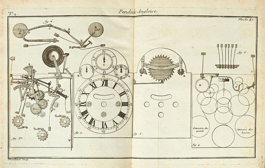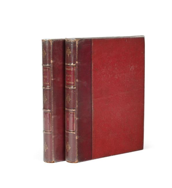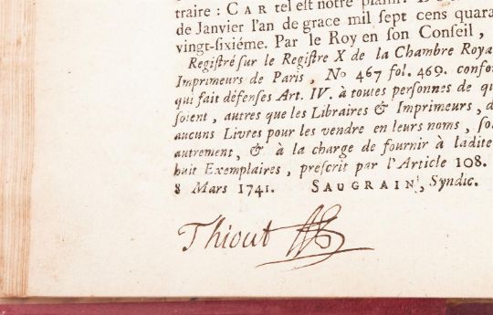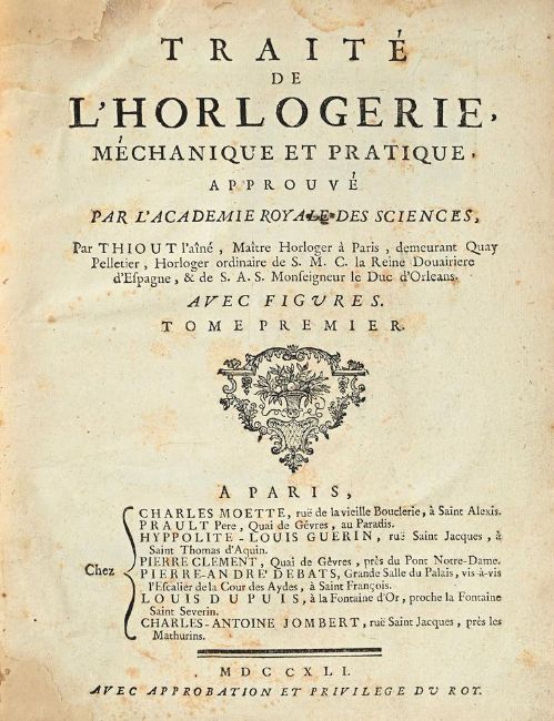 Ɵ THIOUT, ANTOINE TRAITE DE HORLOGERIE MECHANIQUE ET PRACTIQUEFirst edition, two volumes, chez Charles Moette, Paris 1741, signed by the author, 91 folding plates at end, 19th century quarter red morocco, titled and ruled in gilt to spine, 4to, (2). Provenance:Previously in the library of the celebrated French horologist Jean-Claude Sabrier. An important French horological work with detailed plates of movements and tools. The first volume is signed by the author (in ink to the lower margin after the text titled PRIVILEGE DU ROY) and was believed by the late Charles Allix as being one of only two signatures known by Thiout.