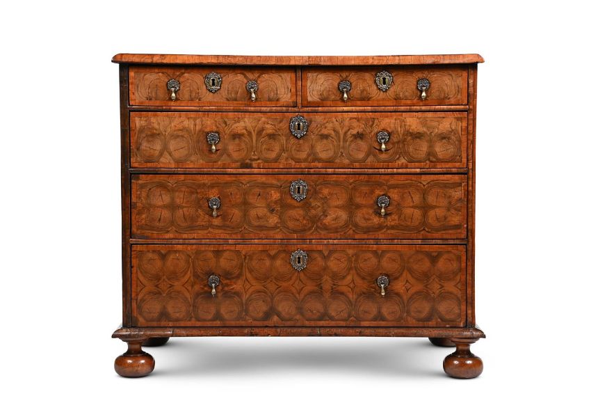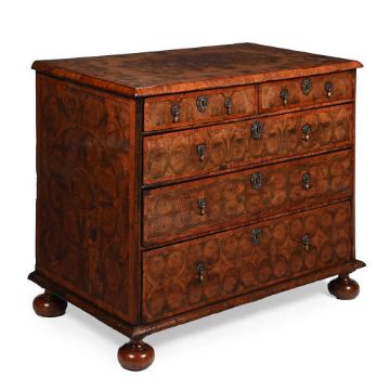 A FINE WILLIAM & MARY OLIVEWOOD OYSTER VENEERED AND FRUITWOOD CROSSBANDED CHEST OF DRAWERS CIRCA 1690 88cm high, 101cm wide, 58cm deep Provenance: Private Collection, Devon For two related chests, see Sotheby's New York, Classic Design: Furniture, Silver & Ceramics (N11464), 16th April 2024, Lot 16 ($17,780 incl. BP) and Christie's London, Important English Furniture and Carpets (6462), 14th June 2001, Lot 200 (£22,325 incl. BP). Condition Report: Marks, knocks, scratches and abrasions commensurate with age and use. Old chips, splits and minor losses Various old veneer and moulding repairs - see images The d-moulding to one side of the front appears to have been repaired and recoloured Backboards are later replacements Evidence of old worm - where this is evident on the finished surface some dark wax or filler has been used to disguise. Handles and escutcheons are later replacements but in period taste and suit the piece well Locks are possibly original No key present but all locks are open. The drawer linings with the expected old repairs in places Bun feet are later replacements Please see all additional images as a visual reference to condition. Condition Report Disclaimer