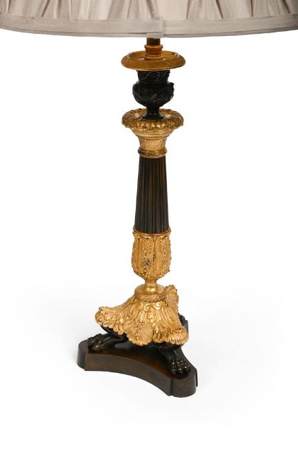 A PAIR OF FRENCH GILT AND PATINATED BRONZE TRIFORM LAMP BASES FIRST HALF OF THE 19TH CENTURY AND LATER Now wired, with pleated shades 32cm high to top of candlestick, 55cm high overall including current shades Condition Report: With wear, marks, knocks and scratches as per age, handling, use, and cleaning. modern shades, wear and rubbing to gilding and patina from prior use and with old polish and deposits to moulding under flared tops, some knocks to bases, drilled for future wiring to underside of stems- not the bases These are sold as decorative items only and although they have modern electrical bulb holders fitted to tops- will require wiring before use by a qualified electrician Please see additional images for visual references to condition which form part of this condition report. All lots are available for inspection and Condition Reports are available on request. However, all lots are of an age and type which means that they may not be in perfect condition and should be viewed by prospective bidders; please refer to Condition 6 of the Conditions of Business for Buyers. This is particularly true for garden related items. All lots are offered for sale "as viewed" and subject to the applicable Conditions of Business for Buyer's condition, which are set out in the sale catalogue and are available on request. Potential buyers should note that condition reports are matters of opinion only, they are non-exhaustive and based solely on what can be seen to the naked eye unless otherwise specified by the cataloguer. We must advise you that we are not professional restorers or conservators and we do not provide any guarantee or warranty as to a lot's condition. Accordingly, it is recommended that prospective buyers inspect lots or have their advisors do so and satisfy themselves as to condition and accuracy of description. If you have physically viewed an item for which you request a report, the condition report cannot be a reason for cancelling a sale. Buyers are reminded that liability for loss and damage transfers to the buyer from the fall of the hammer. Whilst the majority of lots will remain in their location until collected, we can accept no responsibility for any damage which may occur, even in the event of Dreweatts staff assisting carriers during collection. Condition Report Disclaimer