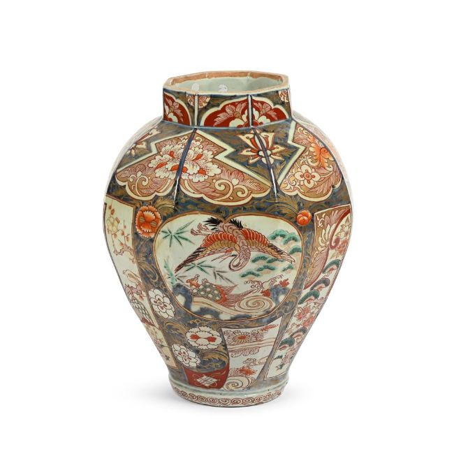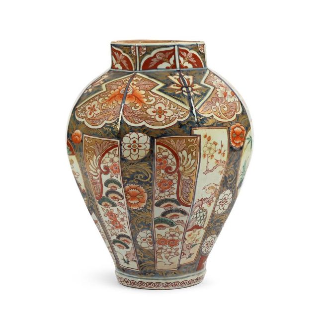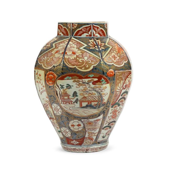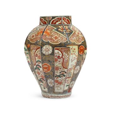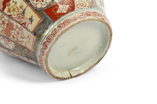 A LARGE IMARI BALUSTER VASE LATE 17TH CENTURY 41cm high, 31cm diameter overall Condition Report: 39.5cm high, the top 16.5cm wide, the base 14.5cm diameter  Condition is generally good with some typical rubbing to gilding from handling, firing faults notably to base, one flaw has expanded slightly upwards into lower edge of main body with diagonal stained cracking, and with characteristic crazing to glaze. Under UV light there are restorers' fingerprints and signs that a thin crack may have had attention to it. Additionally, there has been spotted infill to small areas of loss to one upper panel. Please see additional images. Condition Report Disclaimer