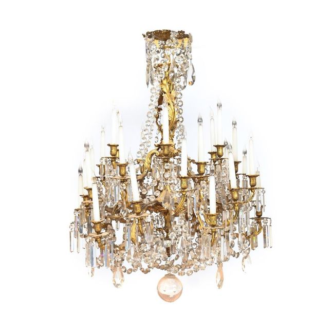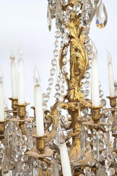 A LARGE CUT GLASS MOUNTED ORMOLU THIRTY LIGHT CHANDELIER