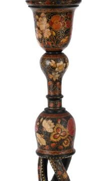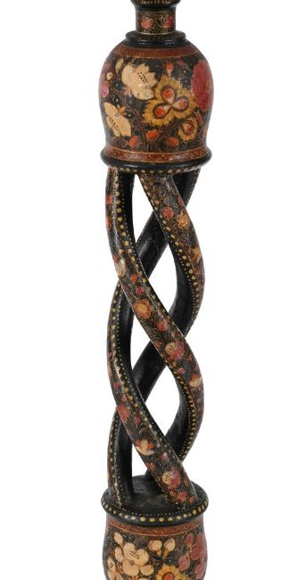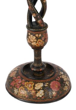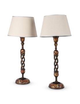 A PAIR OF KASHMIR PAINTED TABLE LAMPS CIRCA 1900 Of characteristic pierced spiral work form, plain cream shades, part fitted for electricity but unwired bases 51cm high, 71cm high overall including current shades
