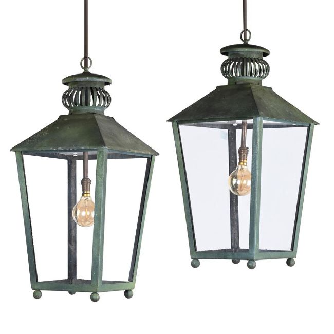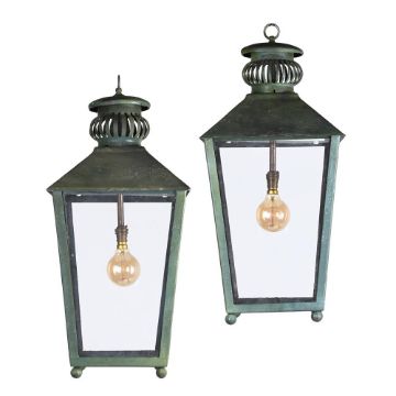 A PAIR OF VERDIGRIS PATINATED METAL FOUR GLASS HALL LANTERNS SECOND HALF 20TH CENTURY 69cm high, 32cm wide, 32cm deep