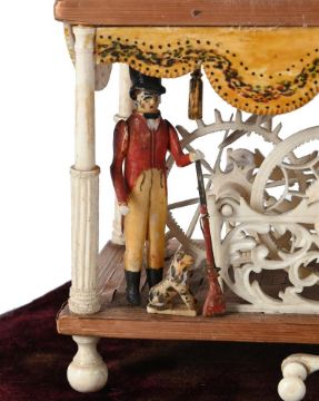 A RARE FRENCH BONE SPINNING JENNY AUTOMATA DIEPPE OR MERU, EARLY 19TH CENTURY Of carved, pierced and part polychrome decorated form, with two straw work platforms, upper level with standing female figure holding distaff behind a spinning wheel, a central, seated lady with distaff, with a pair dancing couple to one side, fiddler and two further female figures to the other side, lower level with pierced central wheel and two supporting cog wheels driving figures on the upper level, two huntsmen to the sides with long guns and dogs, the whole now set in a velvet based, ebonised base clock dome with glass dome the jenny 19cm high, the case 28cm high, 21.5cm wide Provenance: Works of Art from the collection of the late Roger Warner Esq, offered by his family Often catalogued and referred to as "Prisoner of war" models, these rare automata were more likely to have been made by skilled craftsmen working in and around Méru in the Oise district between Paris and the sea. For related examples see Bonham's London, Marine Sale, 8th October 2014, Lot 28 (£15,000 incl. BP) and Skinners Boston, American Furniture & Decorative Arts, 4th March 2012, Lot 413 ($16,590 incl. BP).    Condition Report: With wear, marks, knocks and scratches as per age, handling, use, and cleaning. The whole with typical old and more recent glue repairs- chair backs, small details & reattaching figures to bases etc. Currently not fitted with all requisite threads so when main front handle is turned the figures do not operate. Several internal pillars currently detached which will mean that even if threaded correctly- figures above will not move. Other figures very stiff Losses to straw work and shrinkage faults and some old losses to bone detailing and possible action levers/spurs The whole will benefit from remedial sensitive restoration to bring back to working condition. Please see additional images for visual references to condition which form part of this condition report. All lots are available for inspection and Condition Reports are available on request. However, all lots are of an age and type which means that they may not be in perfect condition and should be viewed by prospective bidders; please refer to Condition 6 of the Conditions of Business for Buyers. This is particularly true for garden related items. All lots are offered for sale "as viewed" and subject to the applicable Conditions of Business for Buyer's condition, which are set out in the sale catalogue and are available on request. Potential buyers should note that condition reports are matters of opinion only, they are non-exhaustive and based solely on what can be seen to the naked eye unless otherwise specified by the cataloguer. We must advise you that we are not professional restorers or conservators and we do not provide any guarantee or warranty as to a lot's condition. Accordingly, it is recommended that prospective buyers inspect lots or have their advisors do so and satisfy themselves as to condition and accuracy of description. If you have physically viewed an item for which you request a report, the condition report cannot be a reason for cancelling a sale. Buyers are reminded that liability for loss and damage transfers to the buyer from the fall of the hammer. Whilst the majority of lots will remain in their location until collected, we can accept no responsibility for any damage which may occur, even in the event of Dreweatts staff assisting carriers during collection.Condition Report Disclaimer