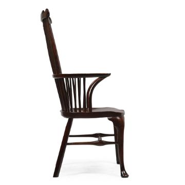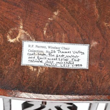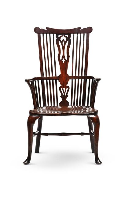 A GEORGE II WALNUT, ELM AND FRUITWOOD HIGH BACK THAMES-VALLEY WINDSOR ARMCHAIR CIRCA 1750 116cm high, 65cm wide, 53cm deep Condition Report: Chair with the marks, knocks, scratches and abrasions commensurate with age and use. The expected old splits and chips. Some old but later nails to the back of the seat 'hoop'. Some of these have been disguised using dark wax. All feet have been re-tipped and coloured to disguise - see images for details. Chair is structurally sound overall. Please refer to additional images for visual reference to condition. Condition Report Disclaimer