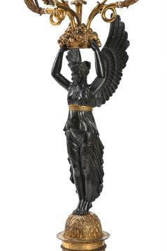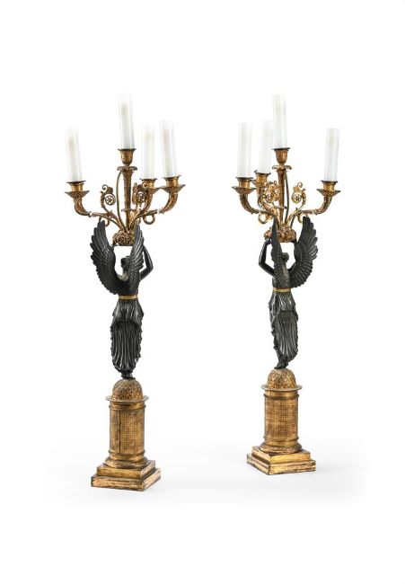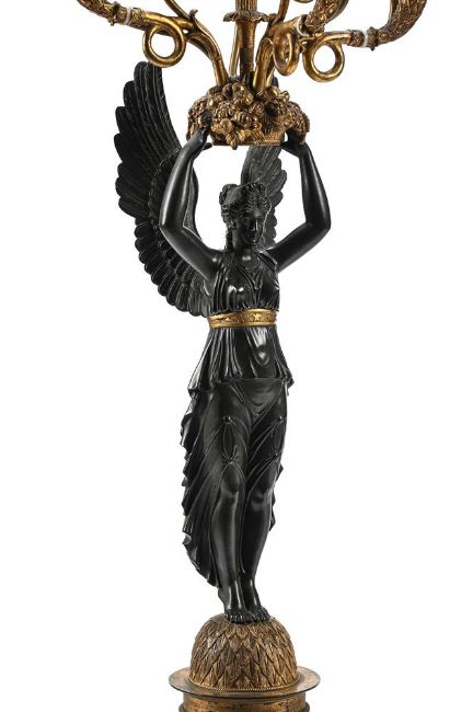 A PAIR OF CHARLES X BRONZE AND ORMOLU FOUR LIGHT CANDELABRA CIRCA 1830 Each with winged figure of Nike holding aloft a basket of fruit and flowers issuing three cornucopia branches, adapted for electricity 99cm high Provenance: The Guy Reed Will Trust, Copgrove Hall, Yorkshire Condition Report: ELECTRICAL GOODS. Sold with a 2024 portable appliance test (PAT) certificate With wear, marks, knocks and scratches as per age, handling, use, and cleaning. With drilled sections from electrical fitting, old deposits to gilding to branches, the bases with fairly heavy rubbing and discolouration to the gilding. Please see additional images for visual references to condition which form part of this condition report. All lots are available for inspection and Condition Reports are available on request. However, all lots are of an age and type which means that they may not be in perfect condition and should be viewed by prospective bidders; please refer to Condition 6 of the Conditions of Business for Buyers. This is particularly true for garden related items. All lots are offered for sale "as viewed" and subject to the applicable Conditions of Business for Buyer's condition, which are set out in the sale catalogue and are available on request. Condition Report Disclaimer