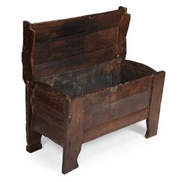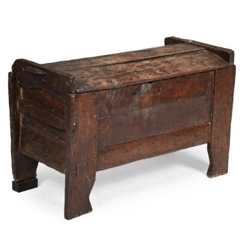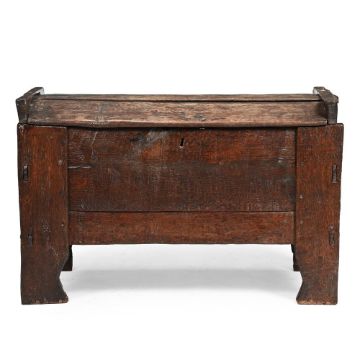 A RIVEN OAK ARK PROBABLY ENGLISH, 16TH OR 17TH CENTURY 72cm high, 111cm wide, 54cm deepProvenance: Works of Art from the collection of the late Roger Warner Esq, offered by his family Condition Report: Marks, scratches and abrasions, old chips and splits comensurate with age and use.Some old losses and repairs. Some elements are loose in their position, to varying degrees, as expected for age and constructionThe main timber elements of the chest/ ark appear to be original although the rear feet sit on later blocks to be more level. One panel of the lid of the ark is detached and needs re-securing. A number of peg/ dowel joints have been variously replaced at various dates and several are fairly modern/ new. There are some later cuts/ incisions and adaptions that appear mainly to be there for the reason of re-fitting/ re -securing the lid. (Please refer to all additional images for visual to reference to these notes and condition generally). Some fading and discoloration comensurate with age and use. Please refer to all additional images for visual reference to condition. Condition Report Disclaimer