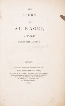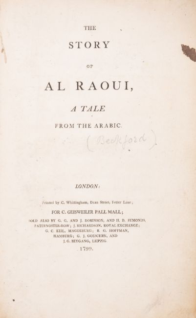 θ [Beckford (William)] The Story of Al Raoui, a Tale from the Arabic, first edition, text in English and German, German in gothic script, a little soiled, small ink stain to margin of title, no endpapers, H.Bradley Martin's copy with his small bookplate, contemporary boards, rubbed and stained, small nick to edge of upper board, spine defective, preserved in modern cloth folder and slip-case, red morocco label, [Chapman 6.i], 8vo, C.Whittingham for C.Geisweiler, London & Leipzig, 1799.