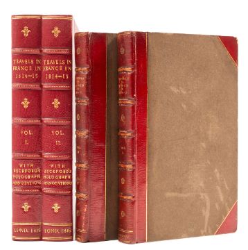 θ Beckford (William).- [Alison (Sir Archibald) & others.] Travels in France, during the years 1814-15. Comprising a Residence at Paris, during the stay of the Allied Armies..., 2 vol., first edition, ?lacking half-titles, William Beckford's copy with 3½pp. pencil notes in his hand on leaf tipped in at beginning of each vol., text lightly browned, a few spots or small stains, H.Bradley Martin's copy with his small bookplate, bound in typical contemporary half red straight-grain morocco, gilt, spines with title and cinquefoils in gilt, g.e., a little rubbed and marked, preserved in modern red morocco-backed drop-back box, spine gilt in compartments with ornaments and five raised bands, 8vo, 1815.
