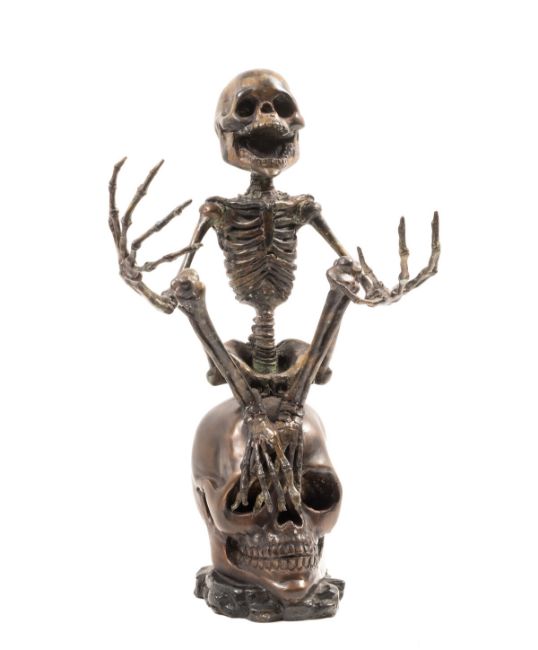 Skeleton seated atop a large skull