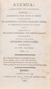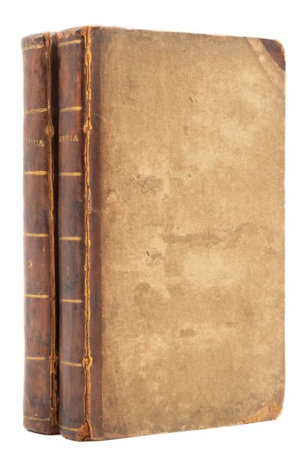 θ [Beckford (William)] Azemia: A Descriptive Novel...By Jacquetta Agneta Mariana Jenks, of Bellegrove Priory in Wales, 2 vol., first edition, with half-titles but lacking M8 at end of each vol. (advertisement leaf in vol.1 and probably blank in vol.2), light spotting and browning, some staining particularly in vol.1, K10 in vol.2 with paper flaw loss to fore-margin not affecting text and M6 lacking lower outer corner just touching catchword, H.Bradley Martin's copy with his small bookplate to rear pastedown, another engraved bookplate to front, contemporary half calf, spine titled and ruled in gilt, rubbed, joints cracked, corners worn, preserved in modern calf-backed drop-back box by Sangorski & Sutcliffe/Zaehnsdorf, spine gilt in compartments with floral motifs and five raised bands, [Chapman 5.i; Garside, Raven & Schowerling], 12mo, Sampson Low, 1797.
