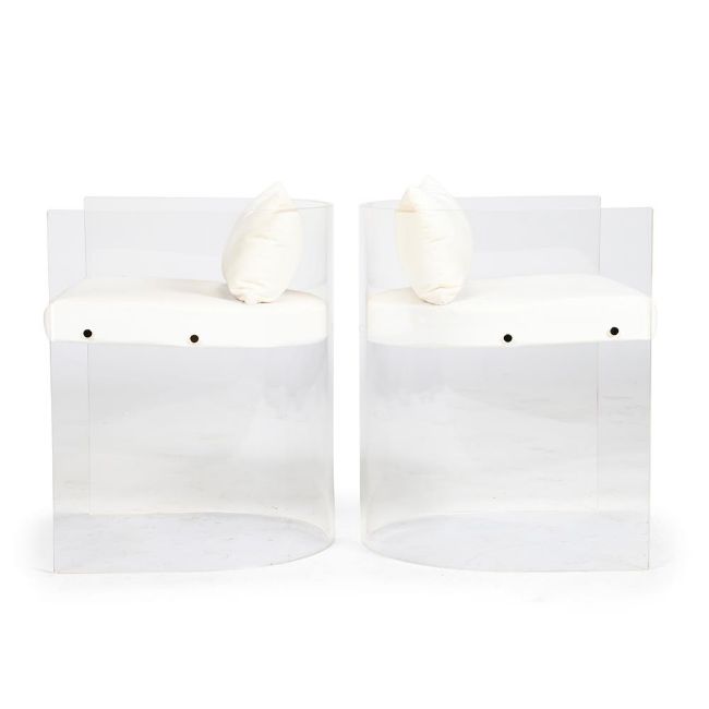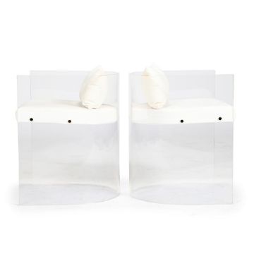 MODERNIST A PAIR OF SIDE CHAIRS; EARLY 21ST CENTURY Plexiglass, white fabric cushioned seat, white fabric cushion 63cm high, 52.5cm wide, 50cm deep
