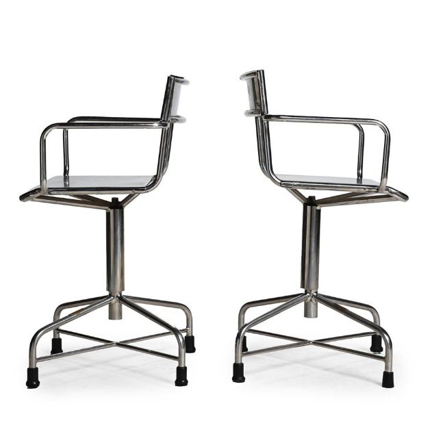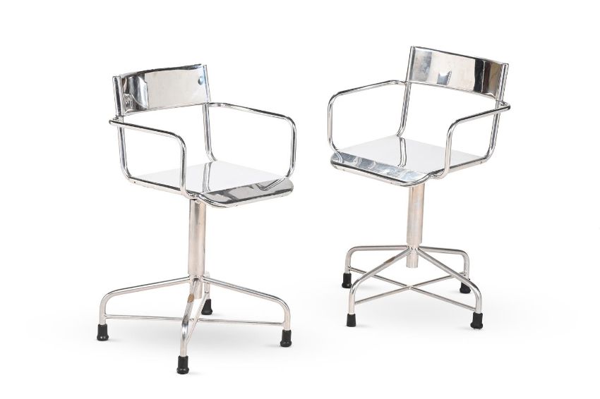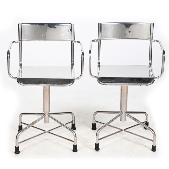 CHAS F. THACKRAY LTD (BRITISH) A PAIR OF REVOLVING ARMCHAIRS; SECOND HALF 20TH CENTURY Polished stainless steel Manufacturer's label to leg 82cm high, 49cm wide, 40cm deep