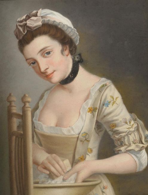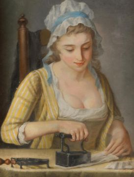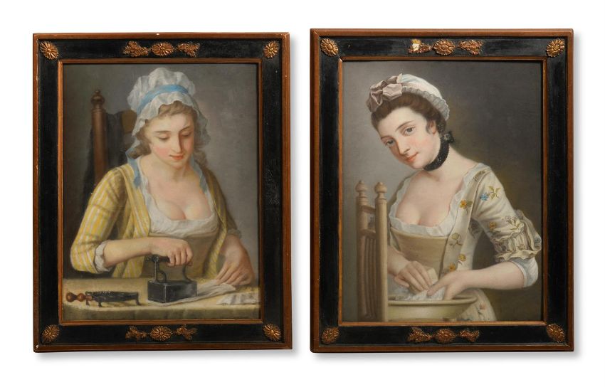AFTER HENRY ROBERT MORLAND A MAID IRONING, AND A MAID WASHING LINEN Pastel 56 x 43cm (22 x 16¾ in.) (2)After the pictures in Tate Britain and The Yale Centre for British Art Condition Report: Both sheets are supported by a board packing panel, but do not appear to have been laid down. Small spots of surface dirt scattered throughout each sheet. Some superficial surface scratching, however both surfaces appear stable. Some very light rubbing and abrasions to the framing edges.Condition Report Disclaimer