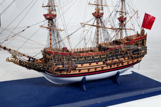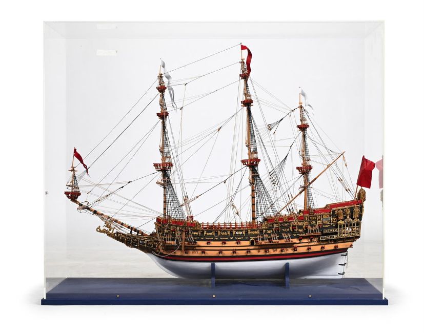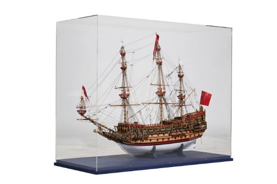 A LARGE MODEL OF THE GALLEON 'SOVEREIGN OF THE SEAS' 20TH CENTURY Housed in a display case case 117.5cm wide, 96.5cm high, 52cm deep Launched in 1637 and also known as the infamous "Golden Devil", HMS Sovereign of the Seas was the largest vessel at the time and was the first ship to be armed with more than 100 guns. Condition Report: With mild wear, marks, knocks and scratches as per relatively modern age, handling, use, and cleaning. The ship largely protected by casing and generally appears to be in good condition- some scuffs to casing. Please see additional images for visual references to condition which form part of this condition report. All lots are available for inspection and Condition Reports are available on request. However, all lots are of an age and type which means that they may not be in perfect condition and should be viewed by prospective bidders; please refer to Condition 6 of the Conditions of Business for Buyers. This is particularly true for garden related items. All lots are offered for sale "as viewed" and subject to the applicable Conditions of Business for Buyer's condition, which are set out in the sale catalogue and are available on request. Condition Report Disclaimer