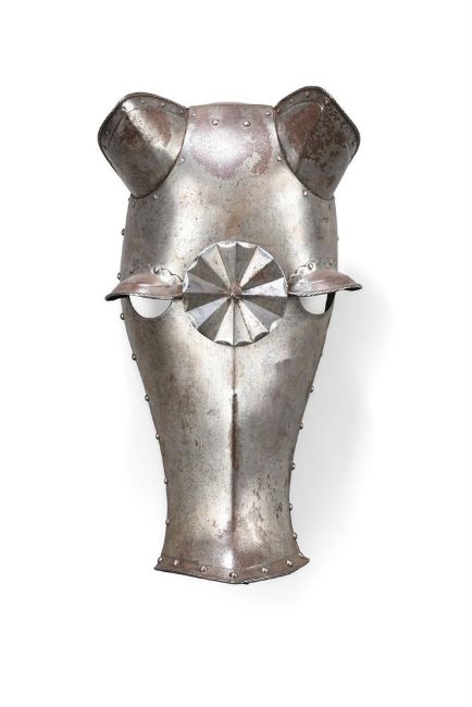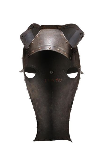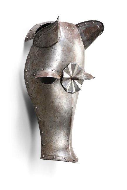 A HORSE HEAD ARMOUR SECTION OR 'SHAFFRON' IN THE 16TH CENTURY STYLE, 19TH CENTURY Formed of a main plate with medial ridge over the lower portion and tapering towards the muzzle, pierced with apertures for the eyes 53cm high