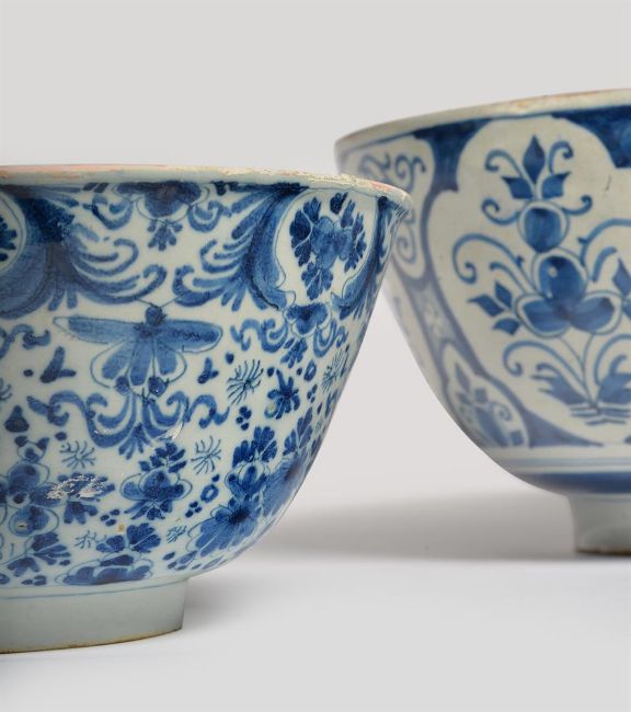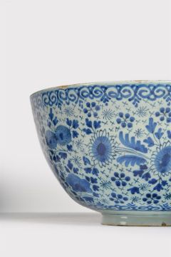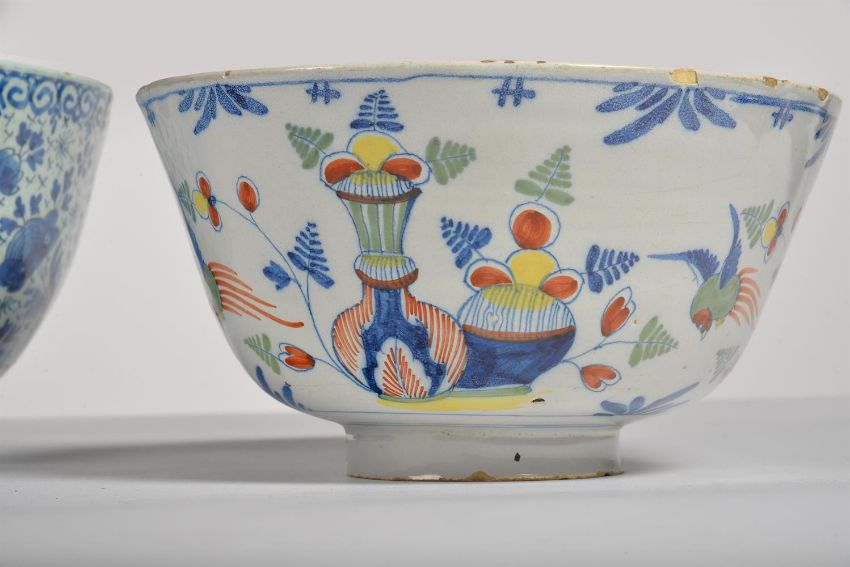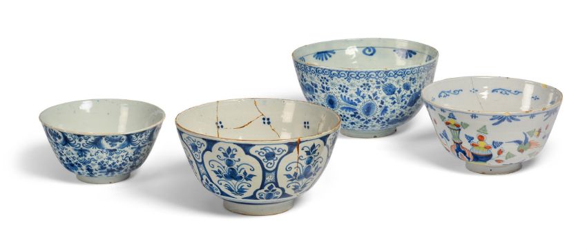 FOUR ENGLISH DELFT PUNCH BOWLS 18TH CENTURY To include a rare Bristol polychrome example largest 16.5cm high, top 30cm diameter Condition Report: Some damage: Please see explanatory images available upon request.  Condition Report Disclaimer
