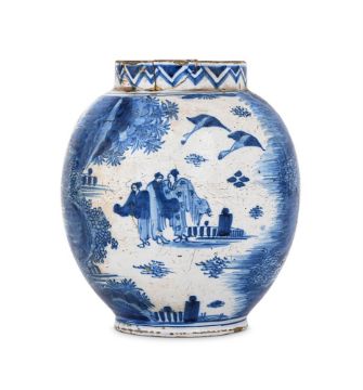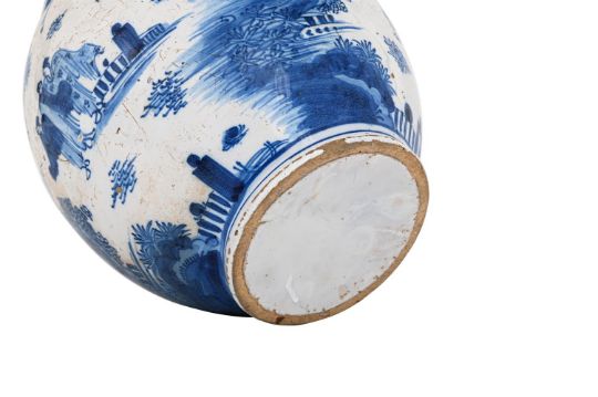 AN ENGLISH TIN GLAZED EARTHENWARE OR DELFT WARE VASE LATE 17TH OR EARLY 18TH CENTURY 21cm high, 19cm diameter Decorated in imitation of Transitional Chinese Porcelain. Condition Report: Section of damaged rim with old tapped repair. Surface scratches and areas of missing glaze revealing the body. Typical condition. Please see additional images available from the Dept. upon request.Condition Report Disclaimer